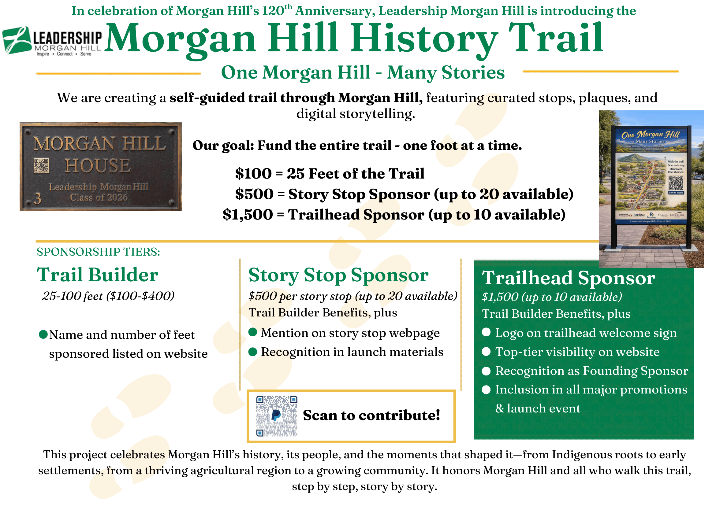 This project will create a self-guided historical trail through downtown Morgan Hill, featuring approximately 20 stops that highlight important landmarks, people, and events in our city’s history. Each stop will include a plaque with a QR code that connects visitors to deeper stories, photos, and audio narration online. (similar to the one below)